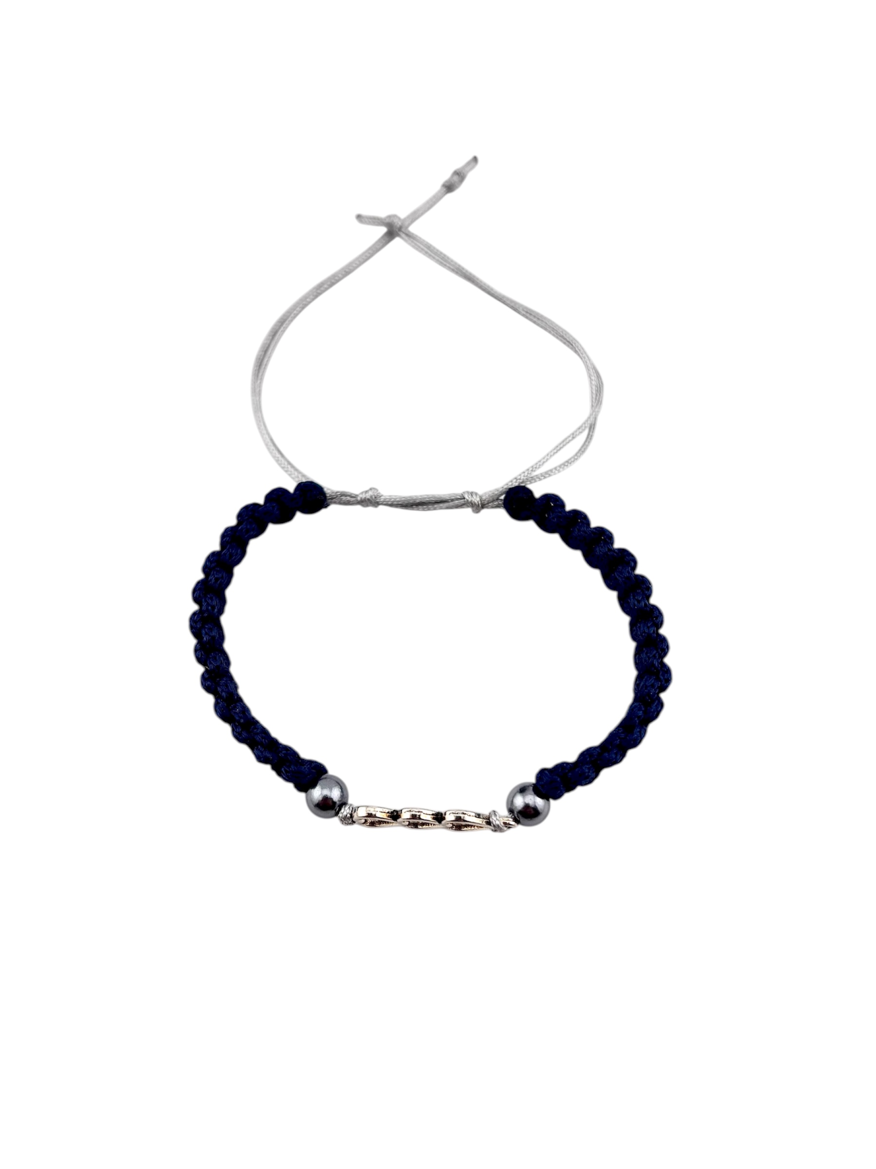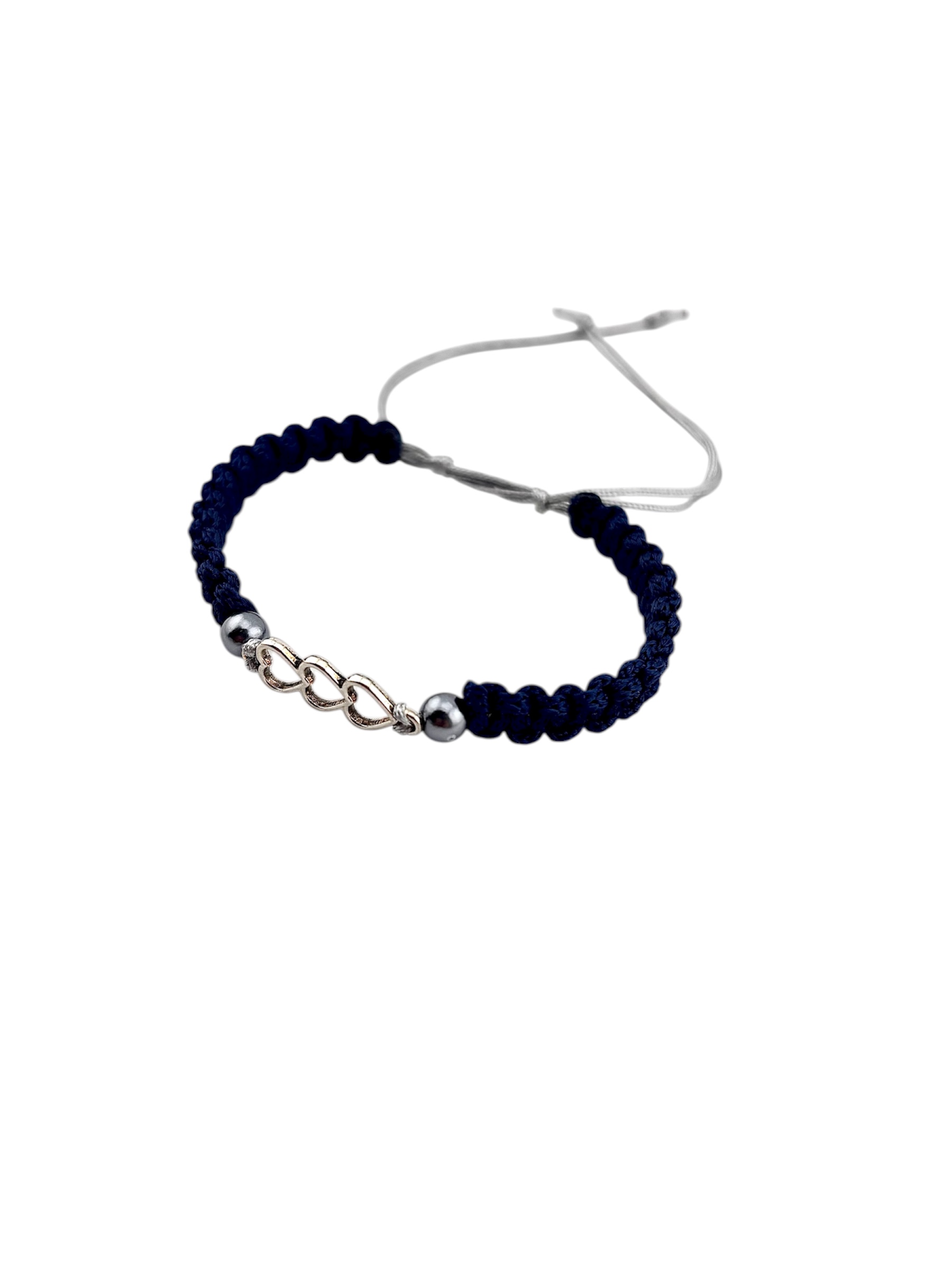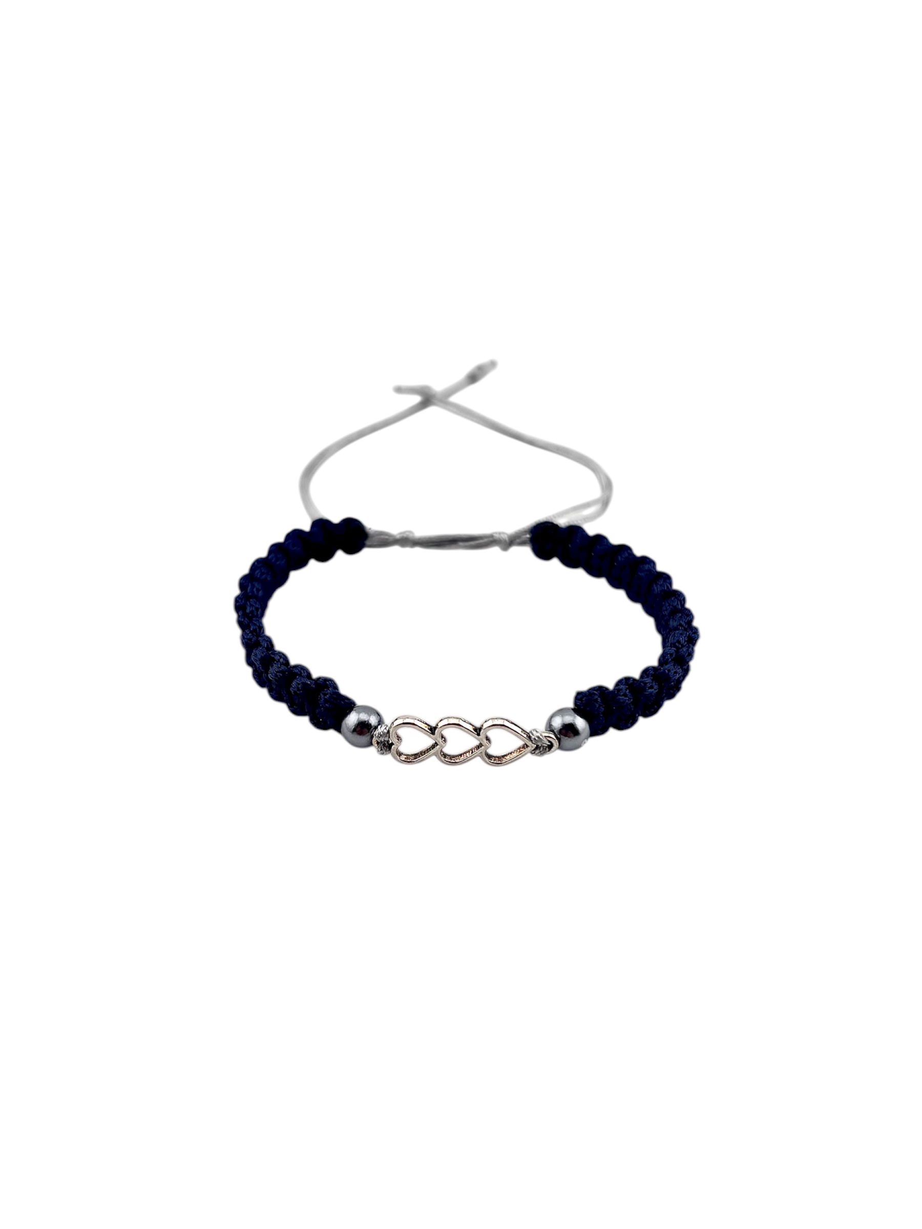 Elégant et symbolique, ce bracelet est entièrement réalisé à la main avec un cordon bleu nuit tressé selon la technique du macramé. En son centre, trois cœurs argentés symbolisant l’amour et le line indéfectible. Des perles métalliques argentées viennent parfaire l’ensemble pour une touche raffinée. Grâce à son line coulissant, il s’adapte facilement à tous les poignets.