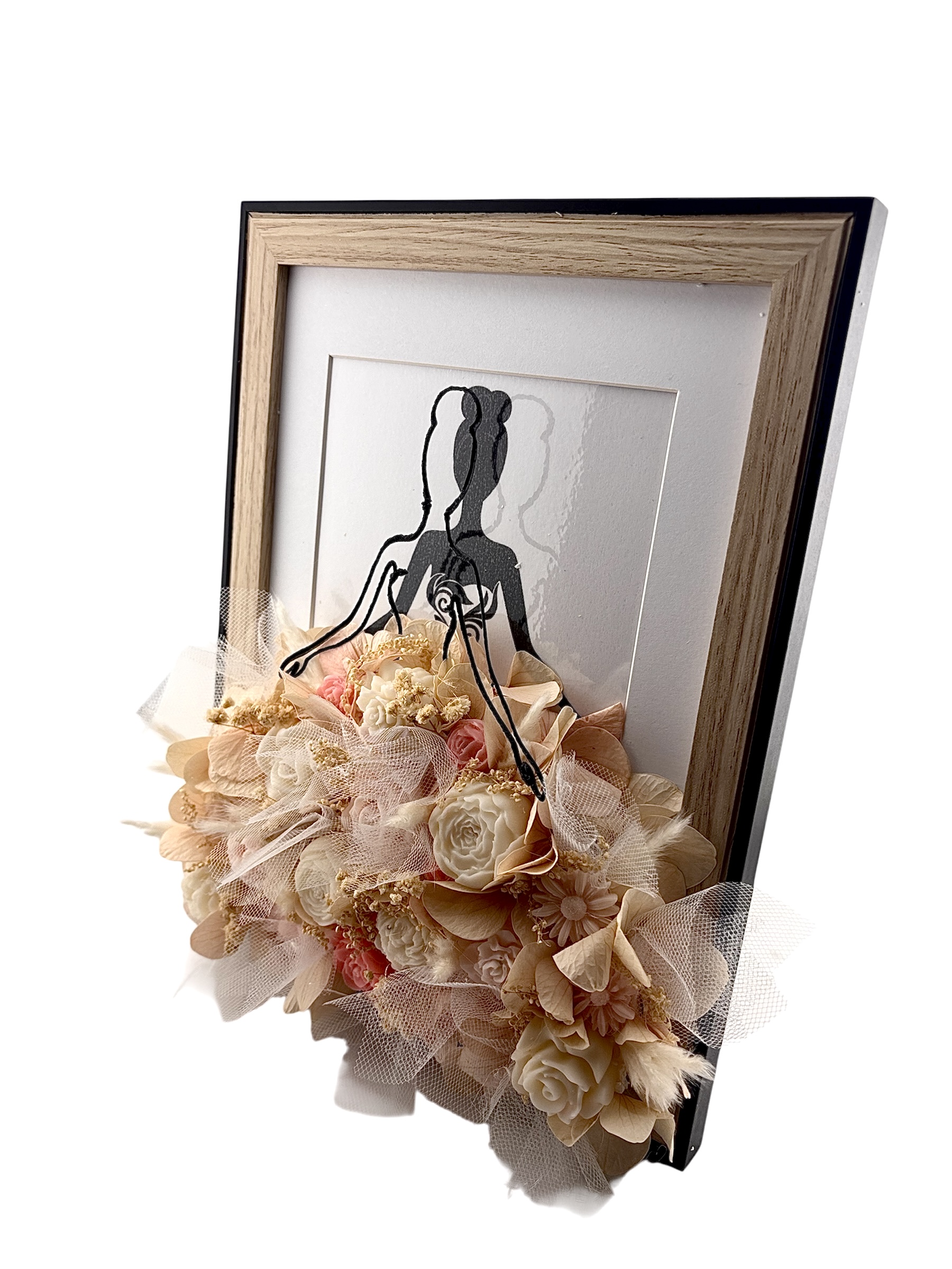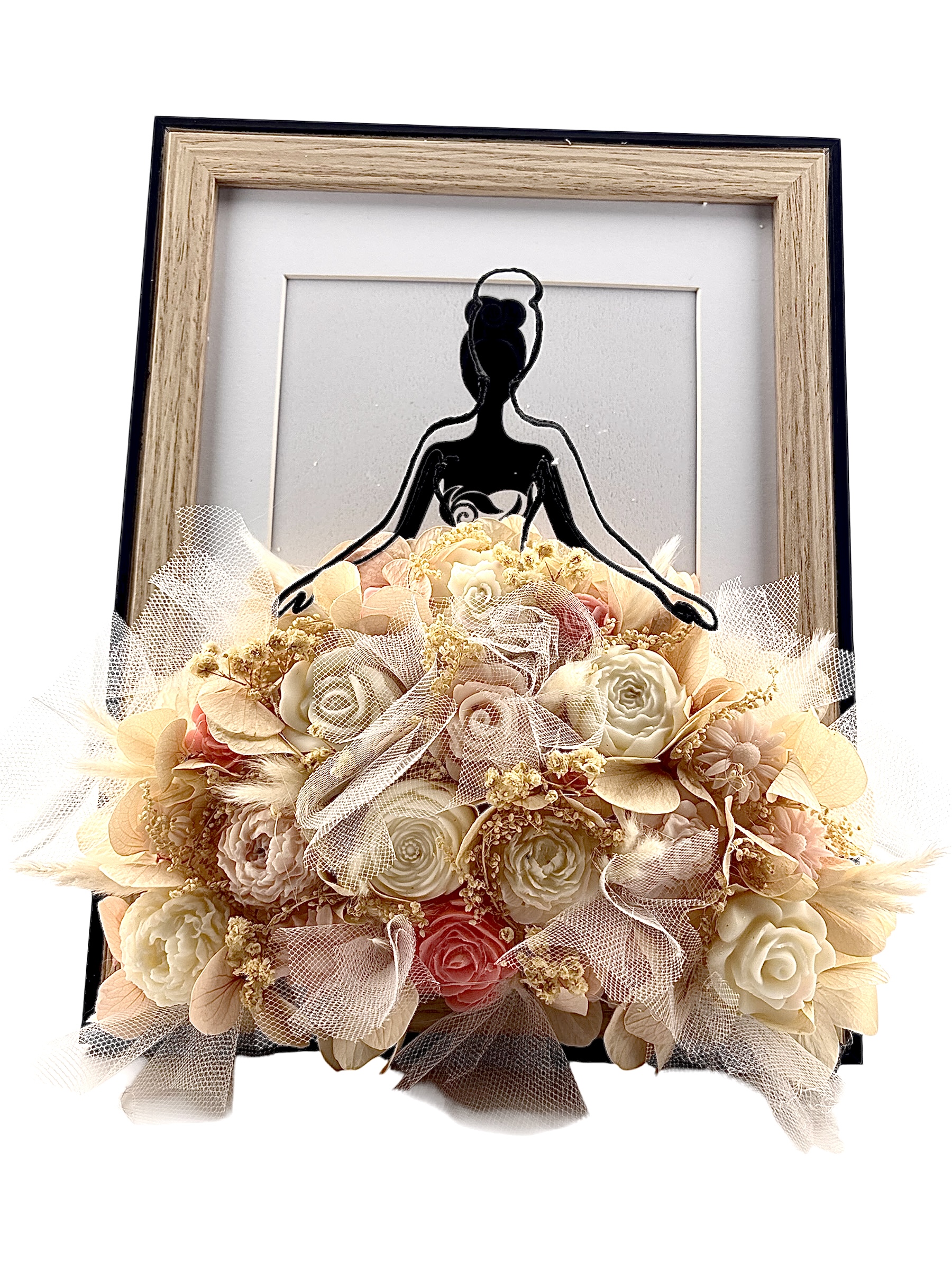 La robe est composé de fleurs en cire de soja parfumées à la fleur de coton, mêlées a du tulle, des fleurs séchées et des fleurs artificielles, créant un volume  élégant et raffiné.