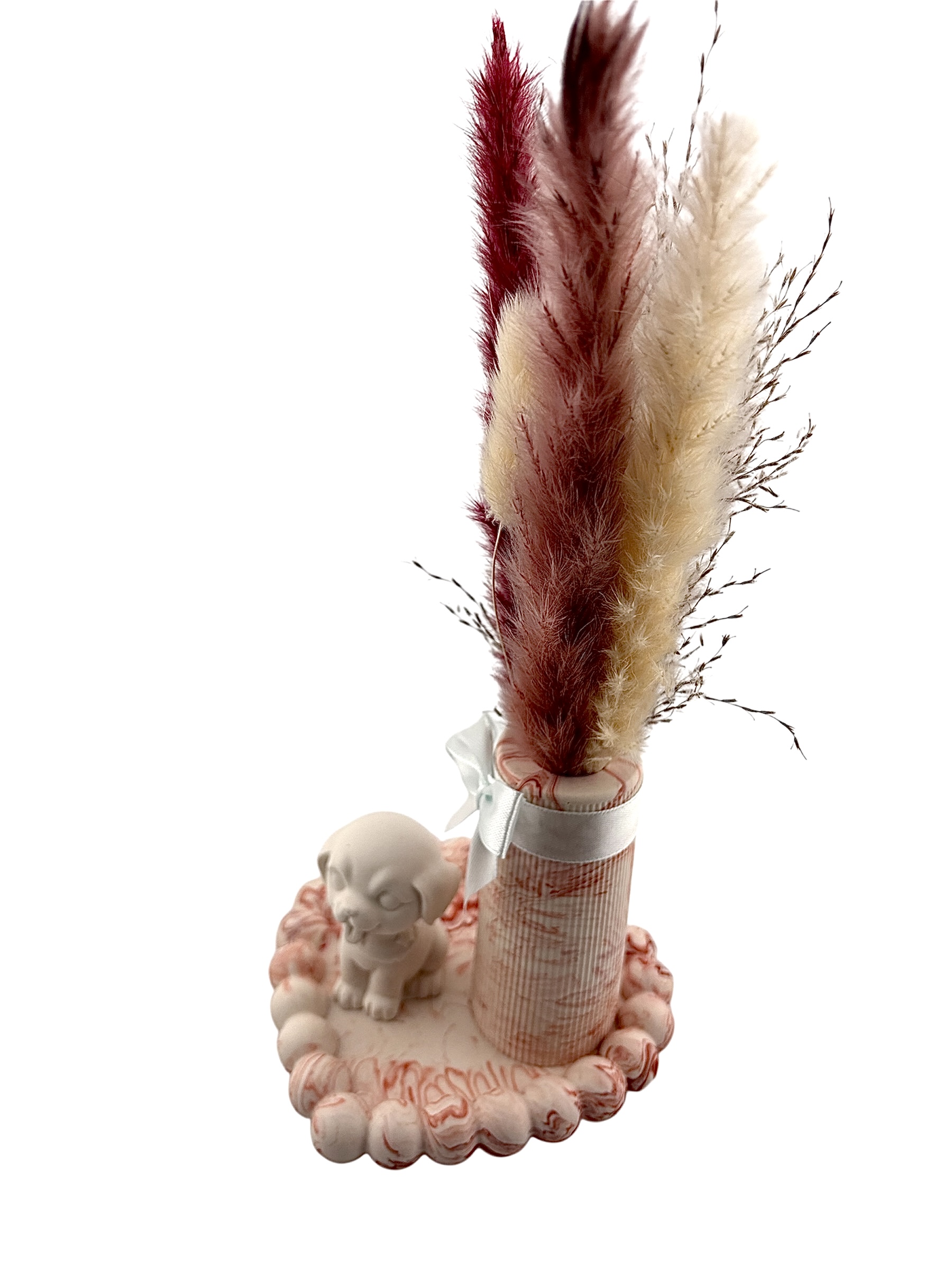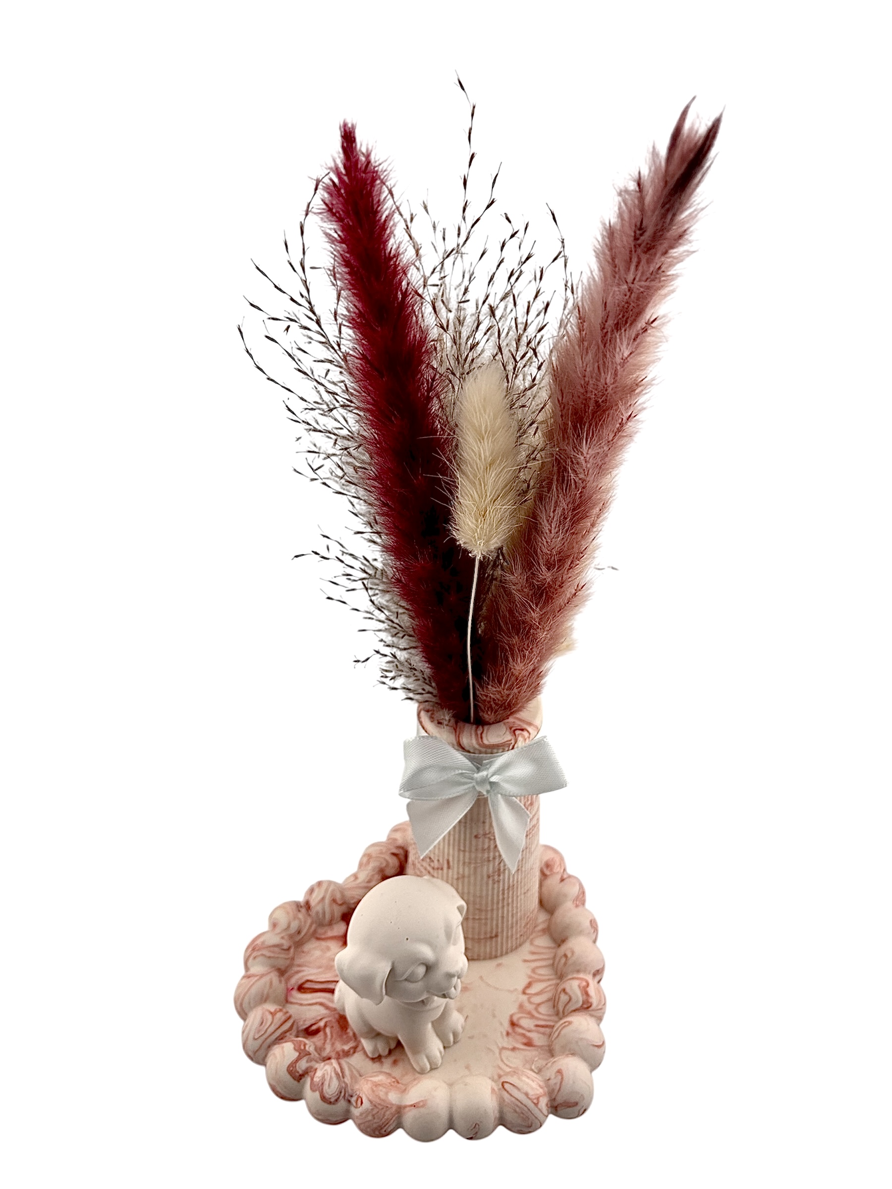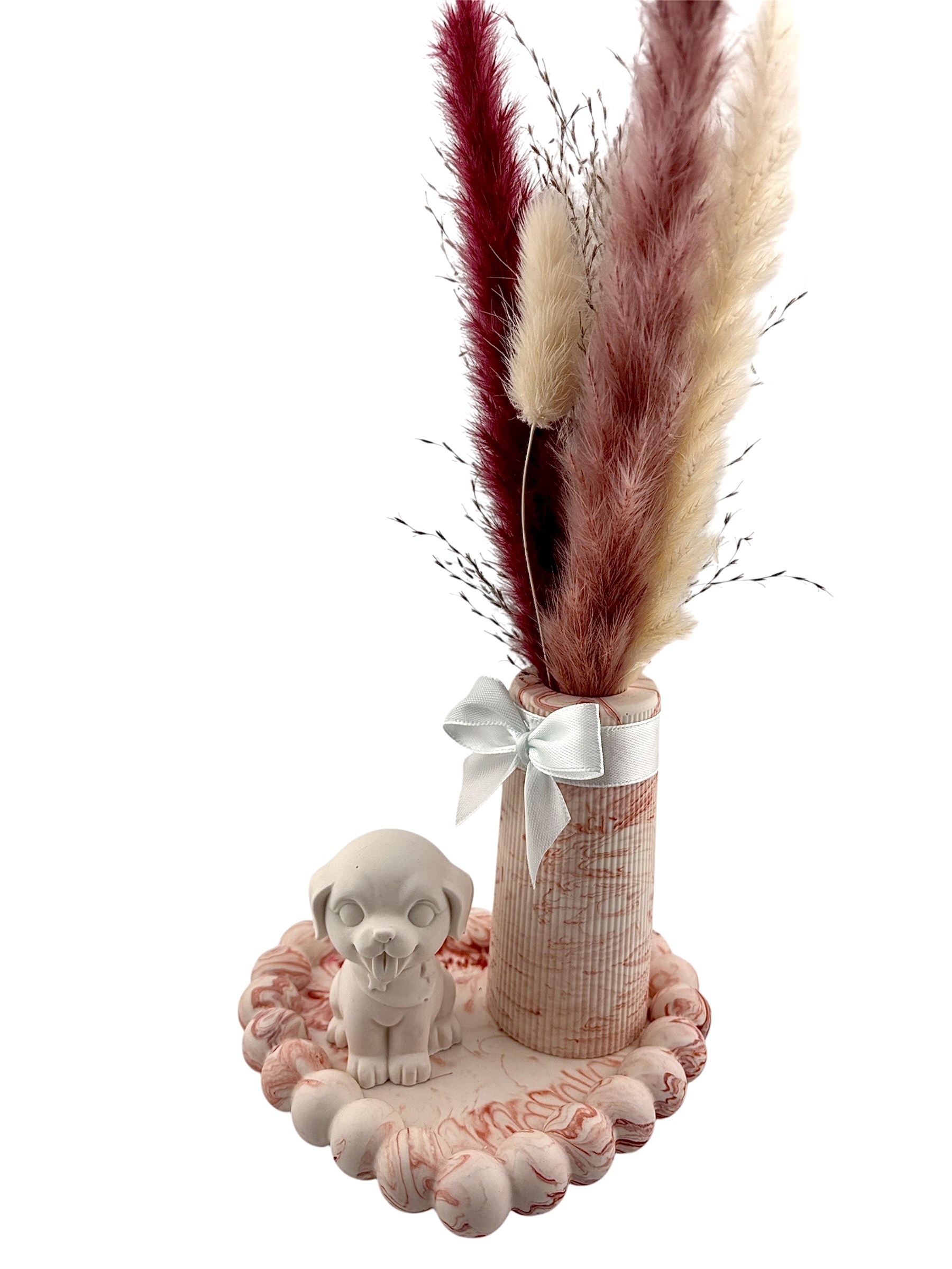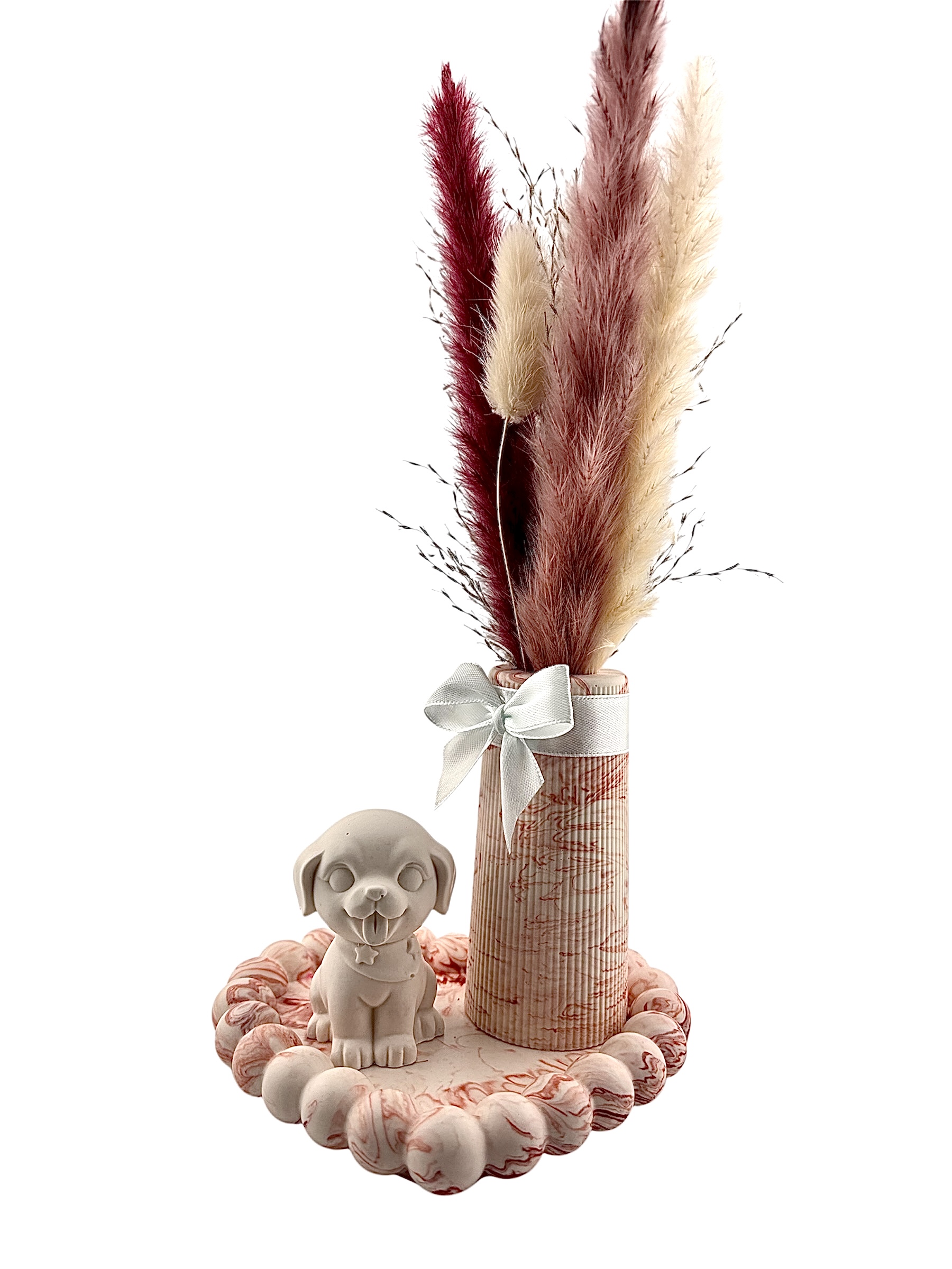 Composition décorative en Jesmonite – Plateau cœur, vase marbré rouge & figurine chien