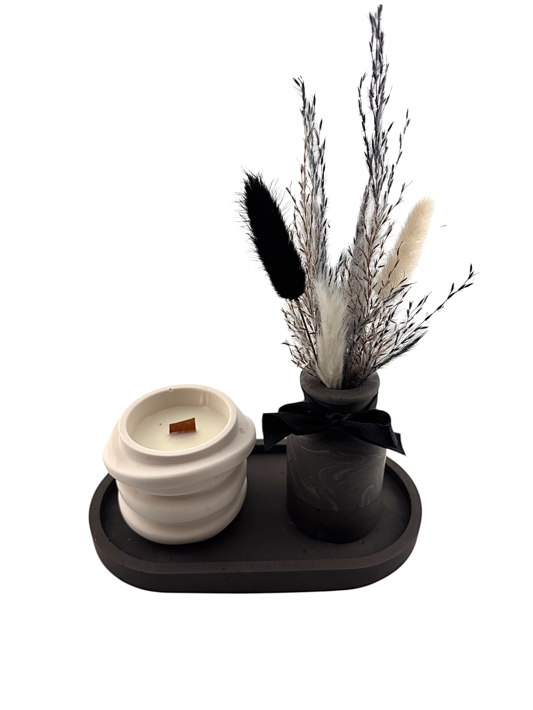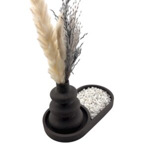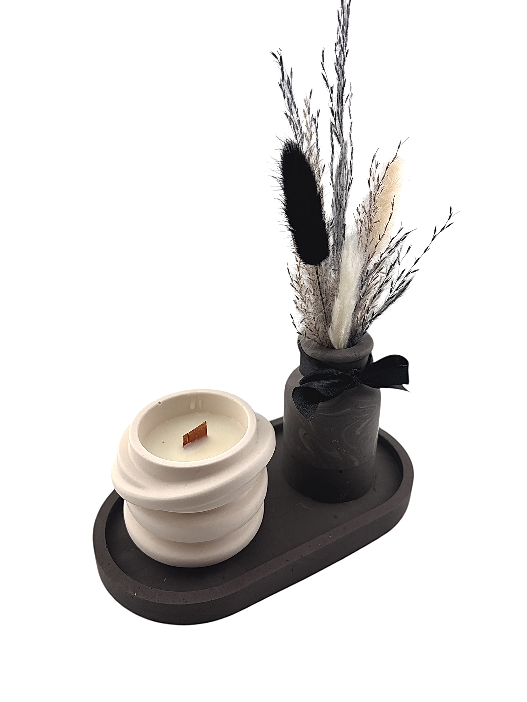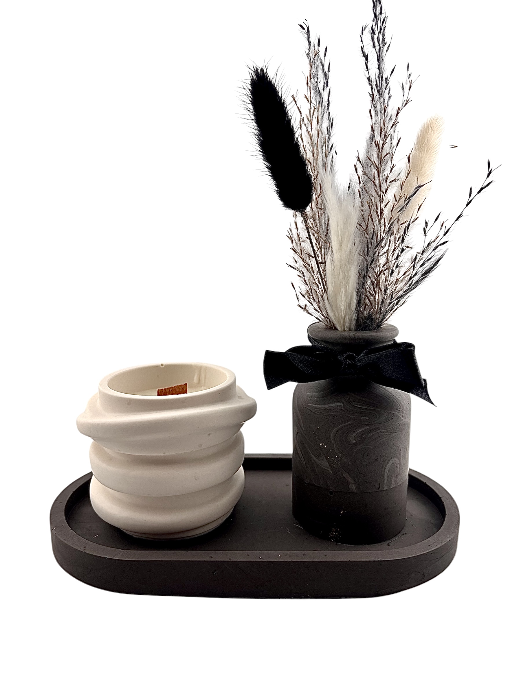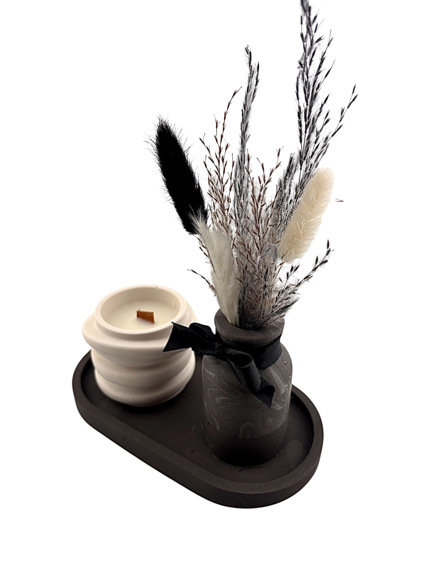 • Un petit vase assorti rempli de fleurs séchées. Le tout présenté sur un plateau en Jesmonite pour un rendu élégant et moderne