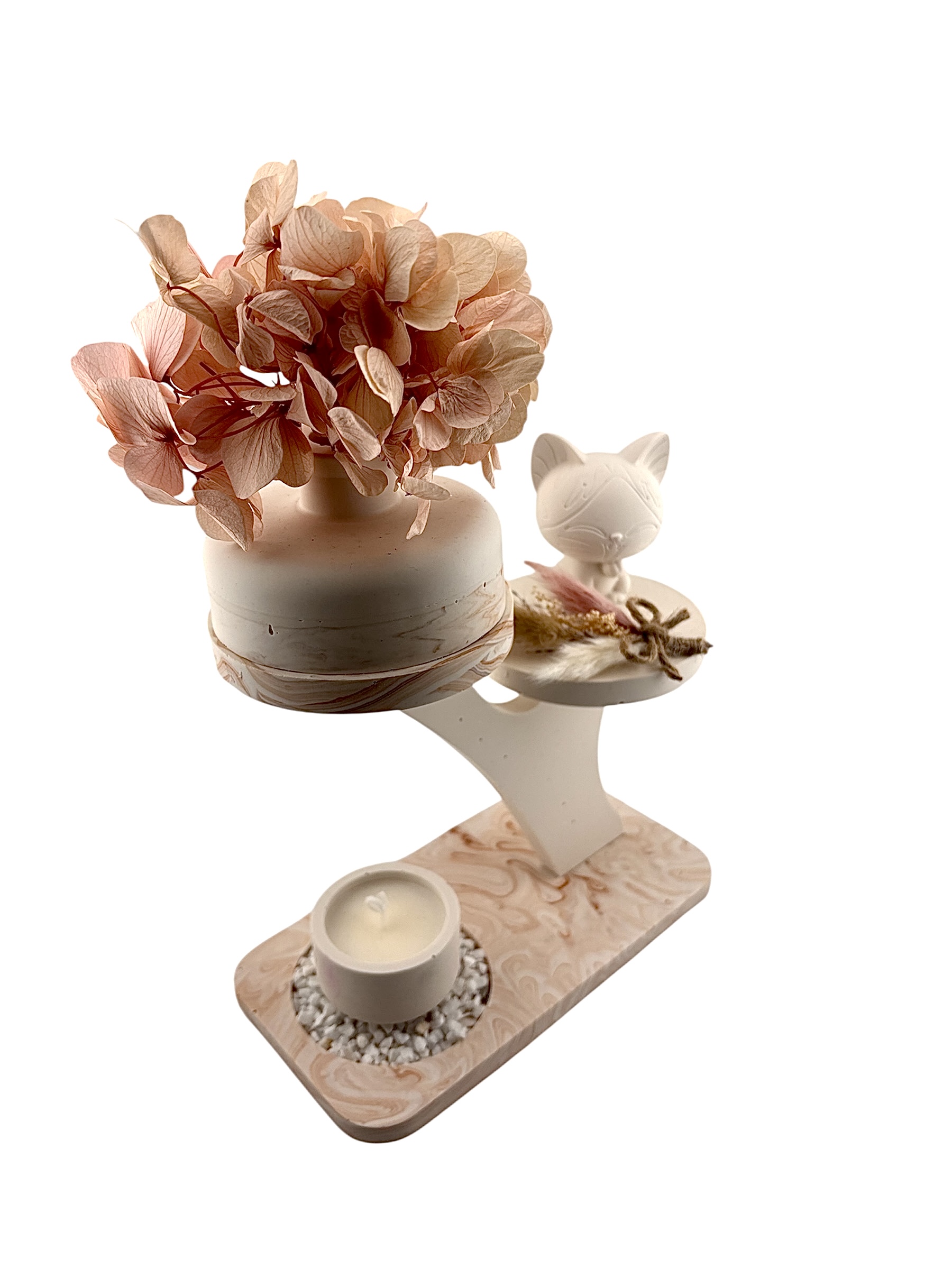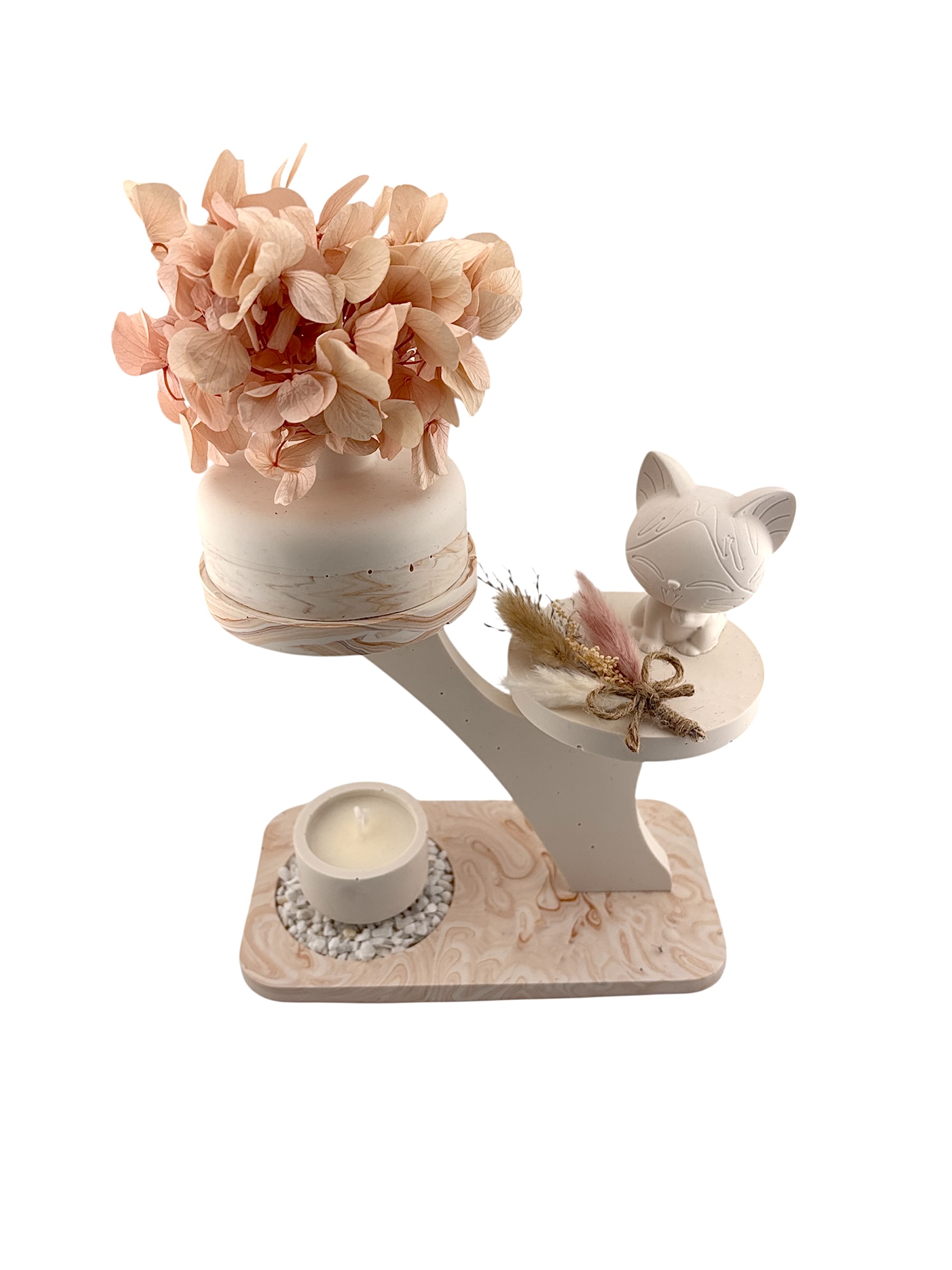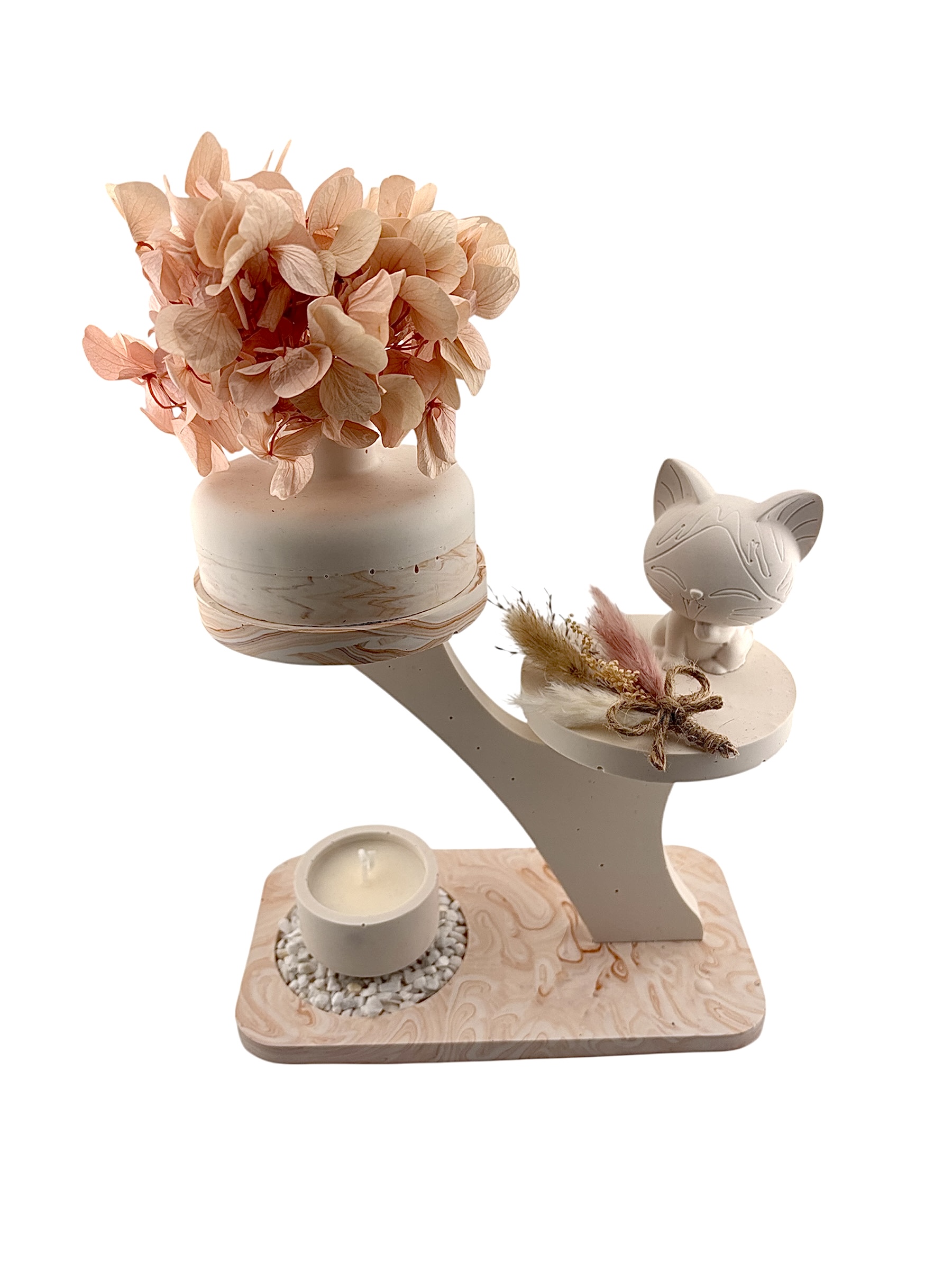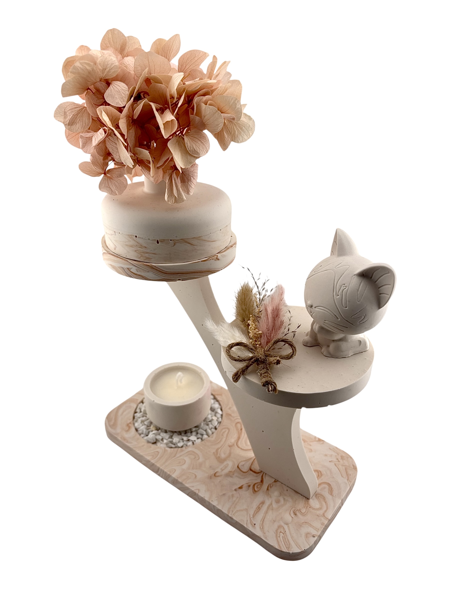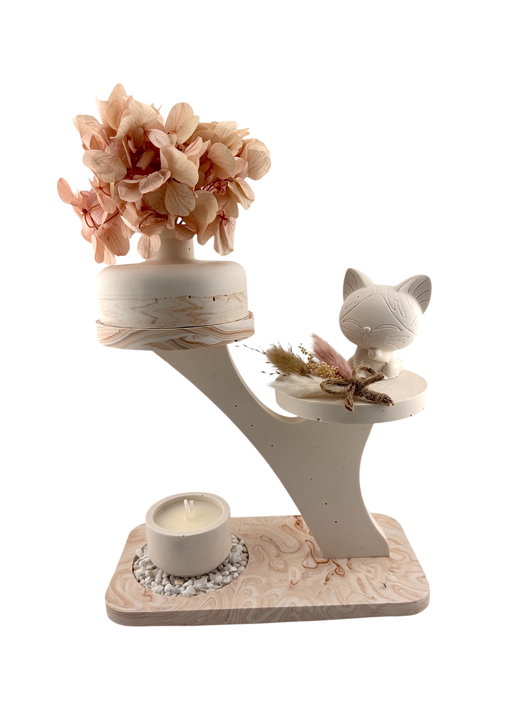 Cette pièce unique allie élégance et poésie grâce à un assemblage réalisé entièrement en Jesmonite. Elle se compose d’un grand vase garni de fleurs artificielles, d’une petite figurine en Jesmonite accompagnée d’un mini-bouquet, ainsi que d’une bougie en cire de soja posée sur son lit de petits cailloux décoratifs. L’ensemble est présenté sur un socle marbré brun, qui apporte chaleur et caractère à cette création.