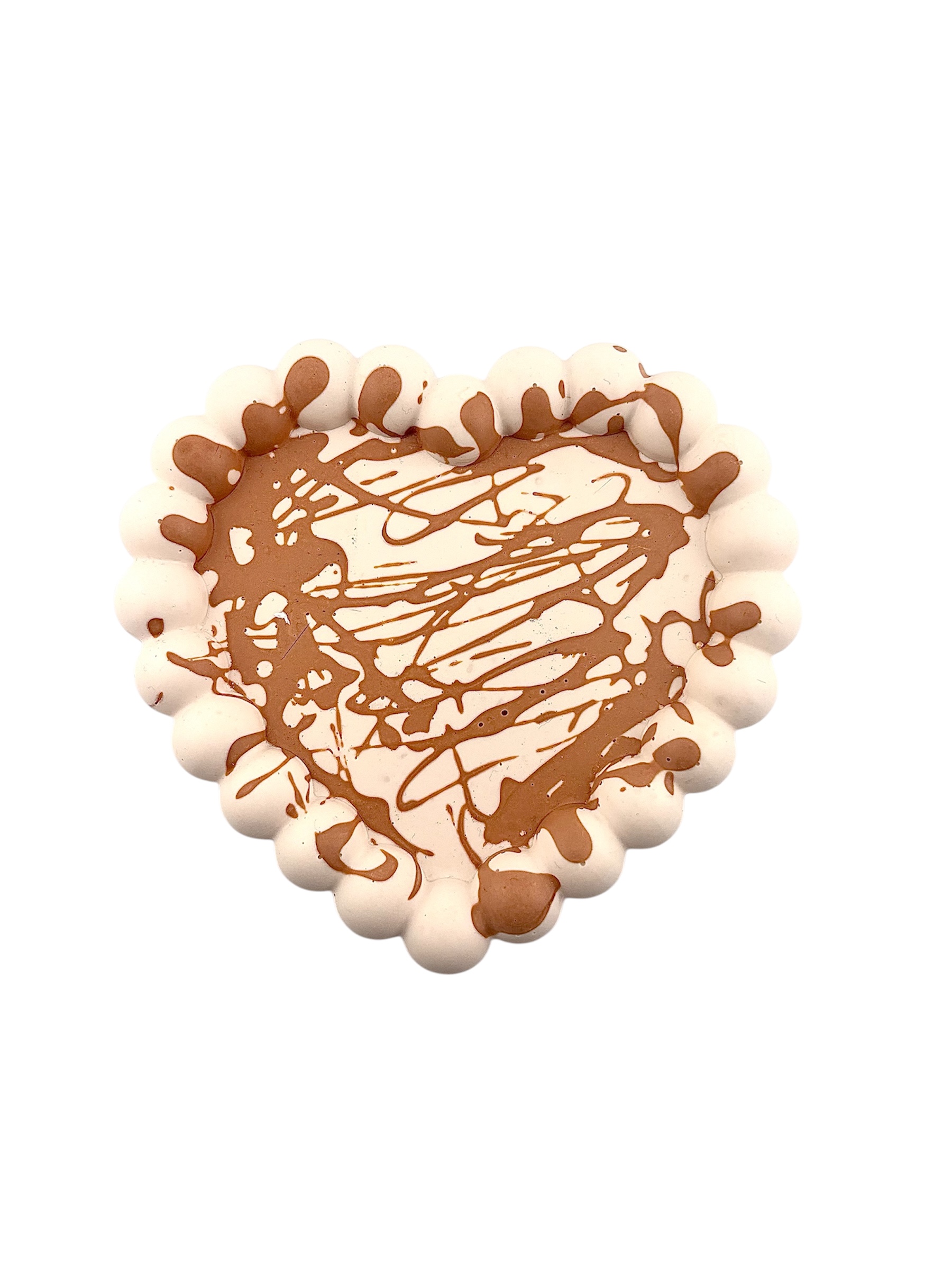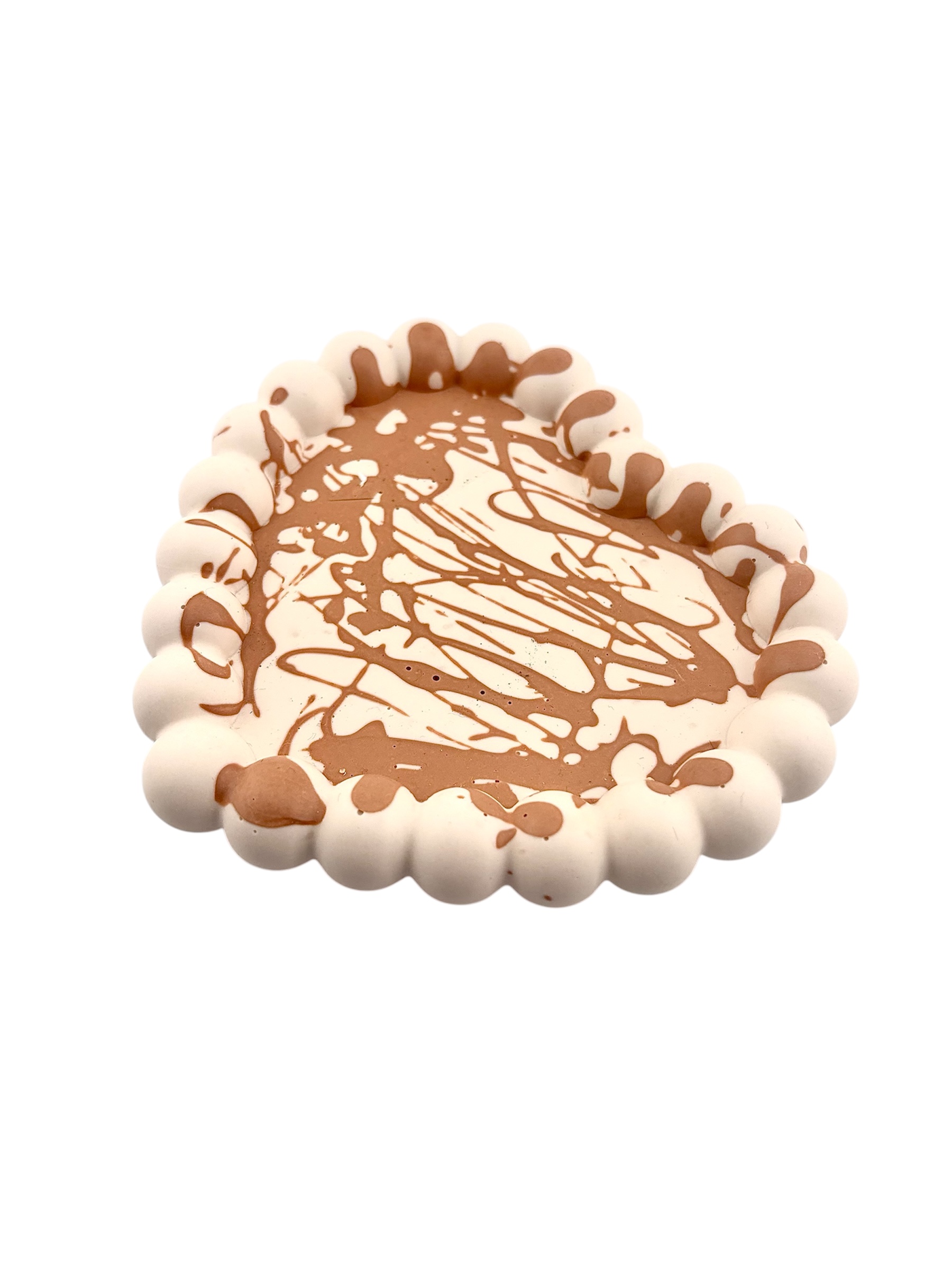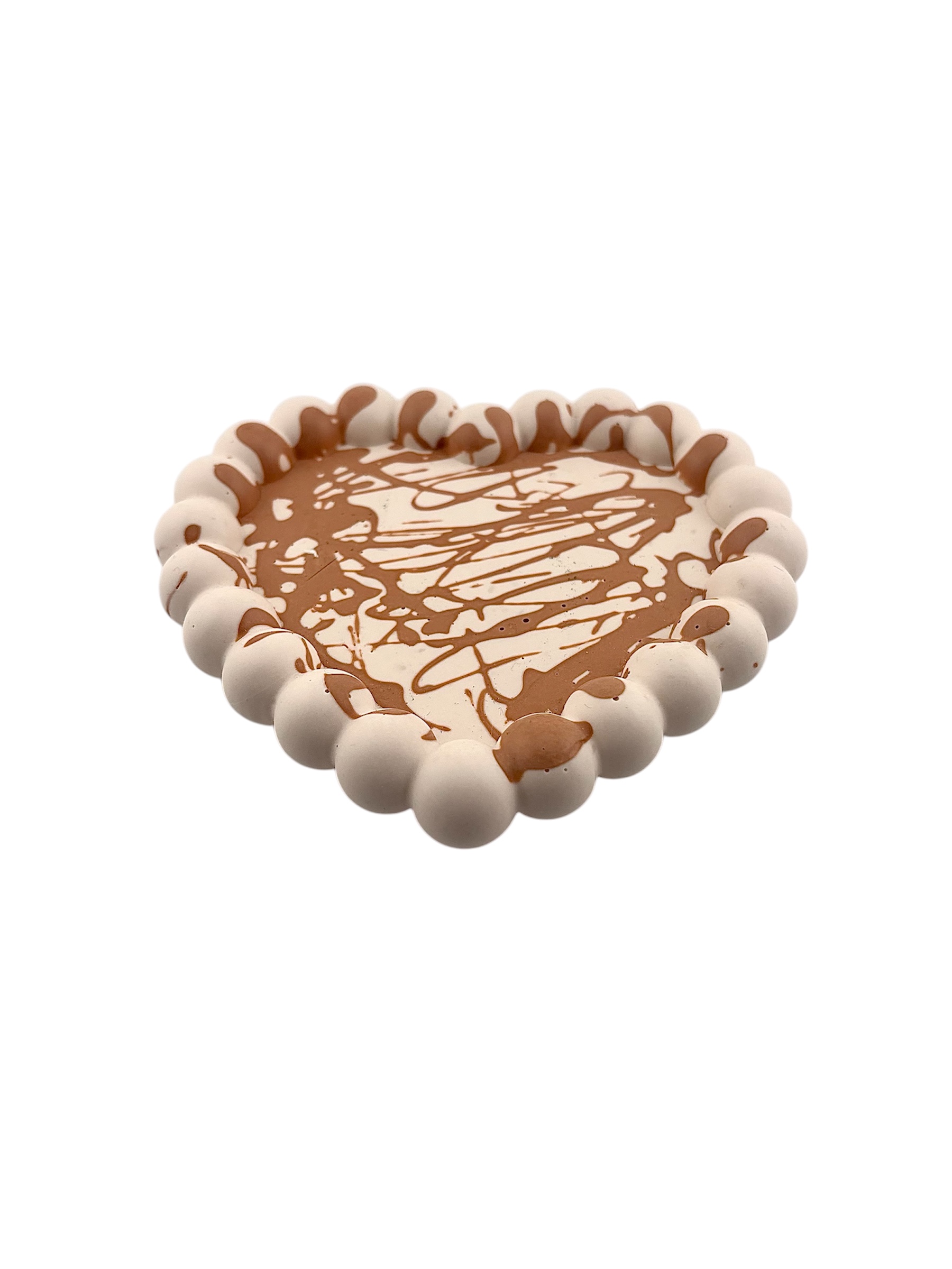 Ce vide-poche en forme de cœur, réalisé à la main en Jesmonite, allie élégance et originalité. Son design unique, avec ses bords perlés et son effet marbré gourmand brun et blanc, apporte une touche chaleureuse et moderne à votre décoration. Chaque pièce est faite artisanalement, rendant chaque modèle unique par ses nuances et motifs.